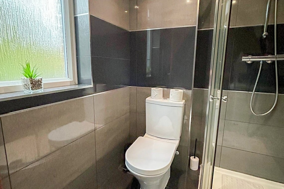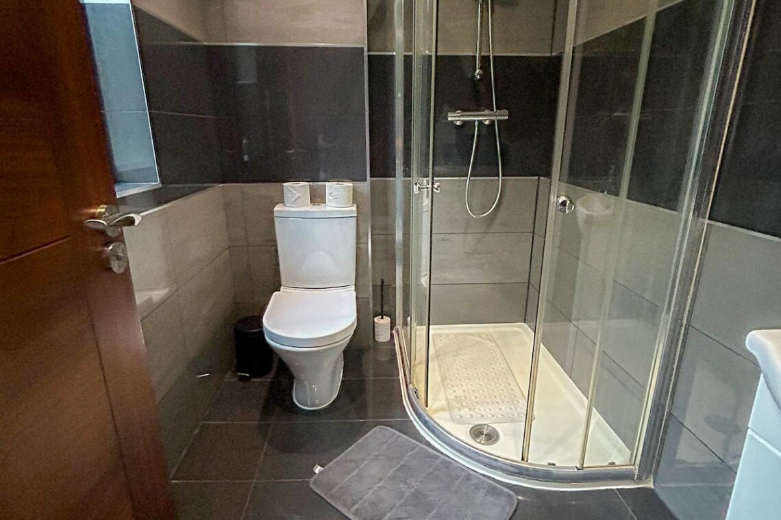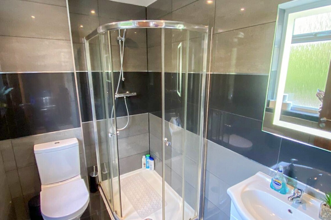 ‣ Bathroom 1: Modern shower room with walk-in shower, toilet, and washbasin